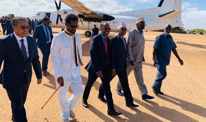 Former President of Galmudug President Abdikarin Hussein Guled and former South West President Sharif Hassan Sheikh Adan arrived in the city of Kismayo on Tuesday.