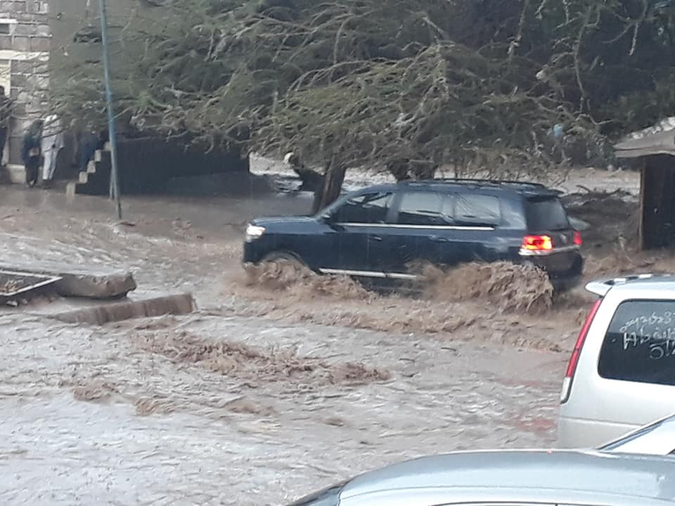A Car crosses floods in Hargeisa at Road-One street near Deero Mall. Junction. Facebook-Photo by Dr Husseiin A. Jama