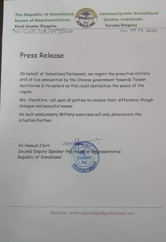 In a press release, the second deputy for the house of Somaliland’s representative noted that they regret the military drill of live ammunition by the Chinese government towards Taiwan’s territories and its waters.