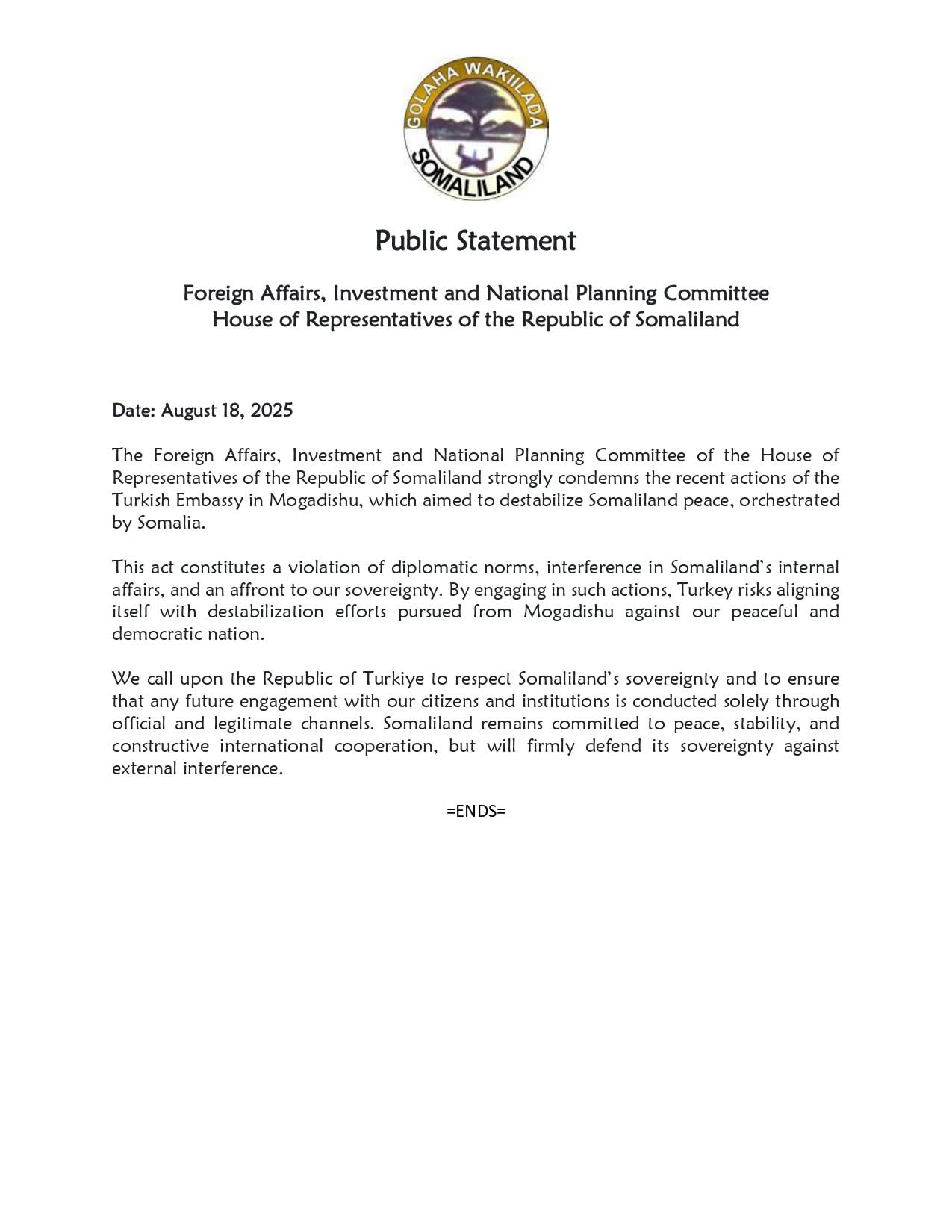 Hargeisa, August 18, 2025 – The Foreign Affairs, Investment and National Planning Committee of the House of Representatives of the Republic of Somaliland has strongly condemned the recent actions of the Turkish Embassy in Mogadishu.